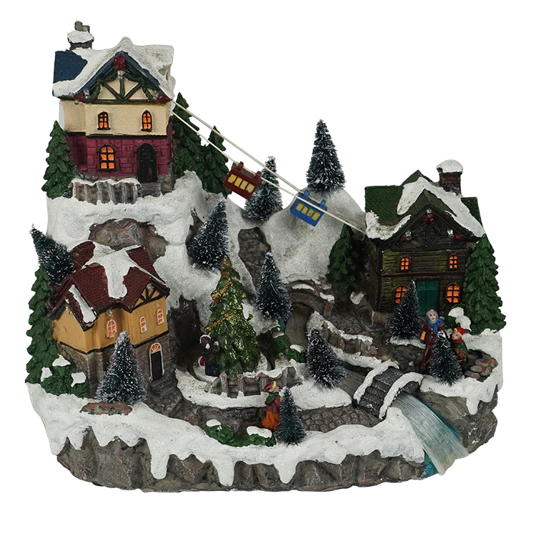 Custom made LED musical mountain house fiber optic resin Christmas village with rotating Xmas tree and moving cable car