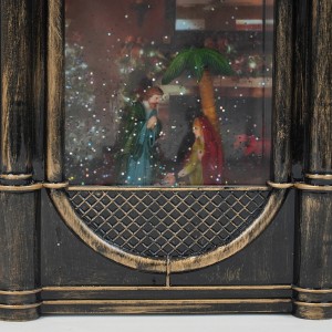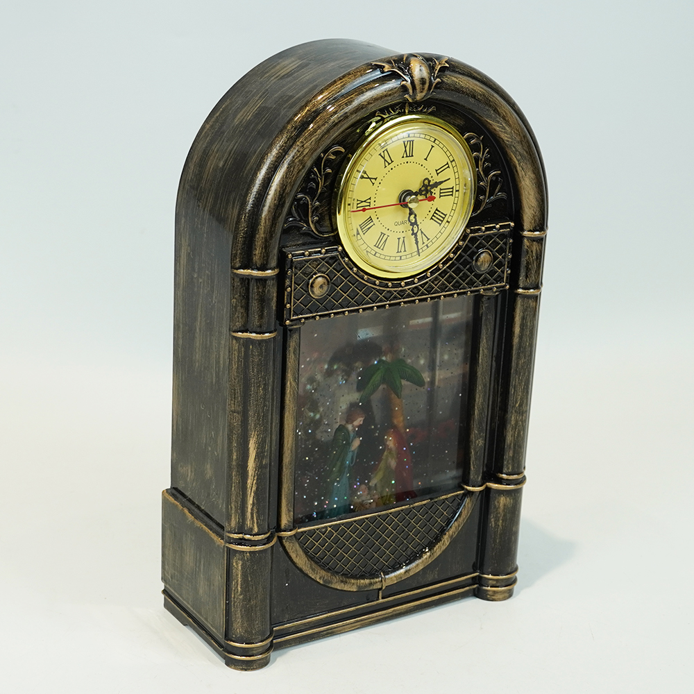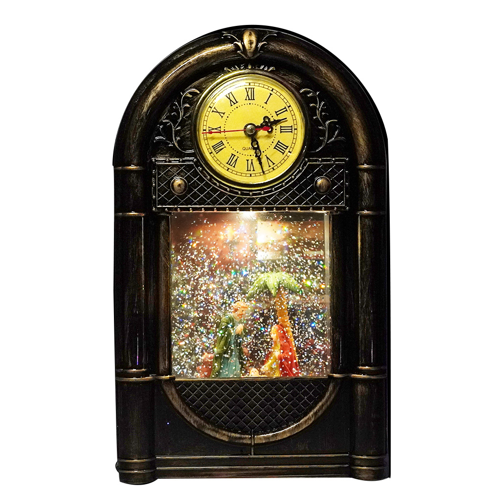 Custom Vintage nativity scene musical clock shaped water spinning Christmas Led snow globe |