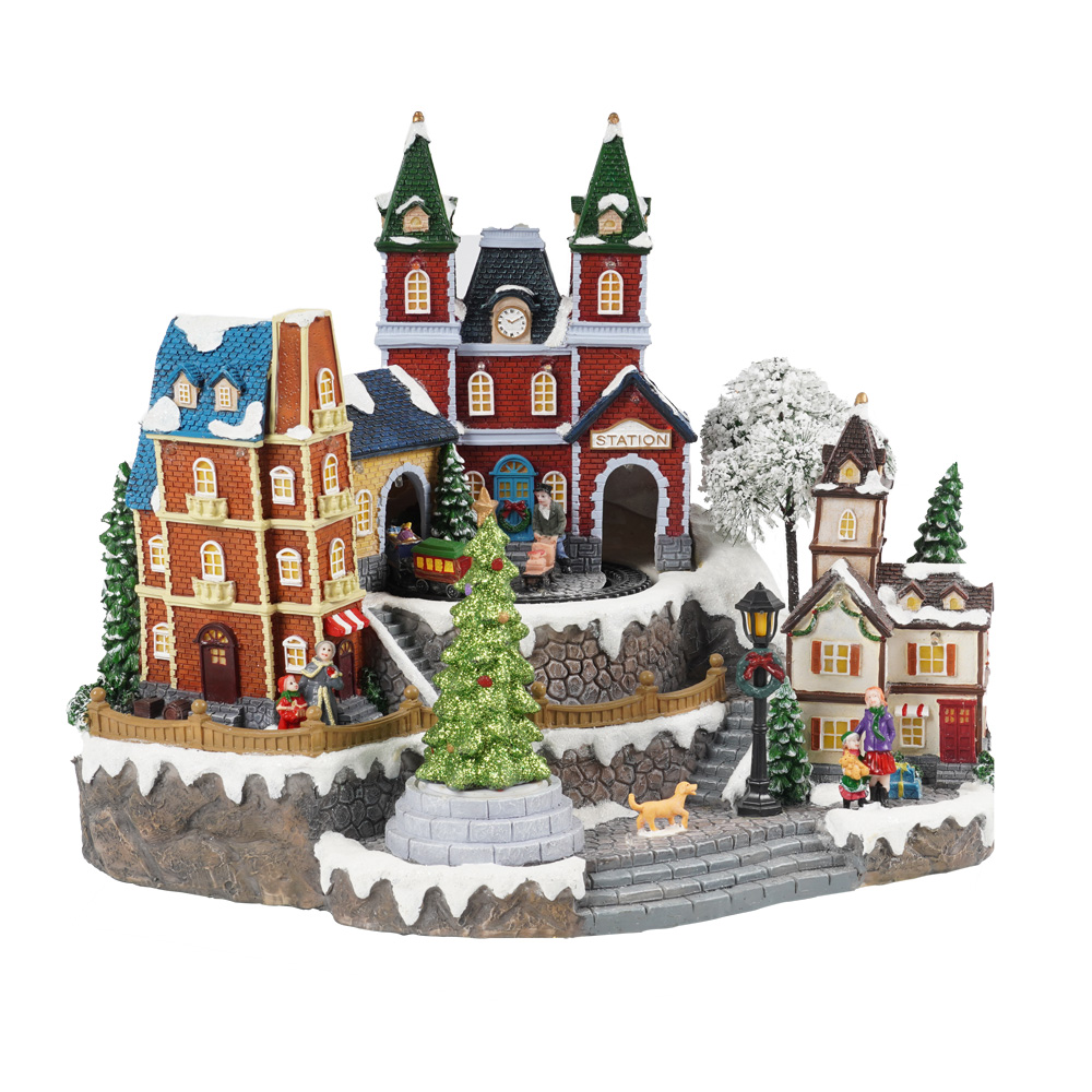 Xmas themed train station model, custom made seasonal resin animated Led musical Christmas Village