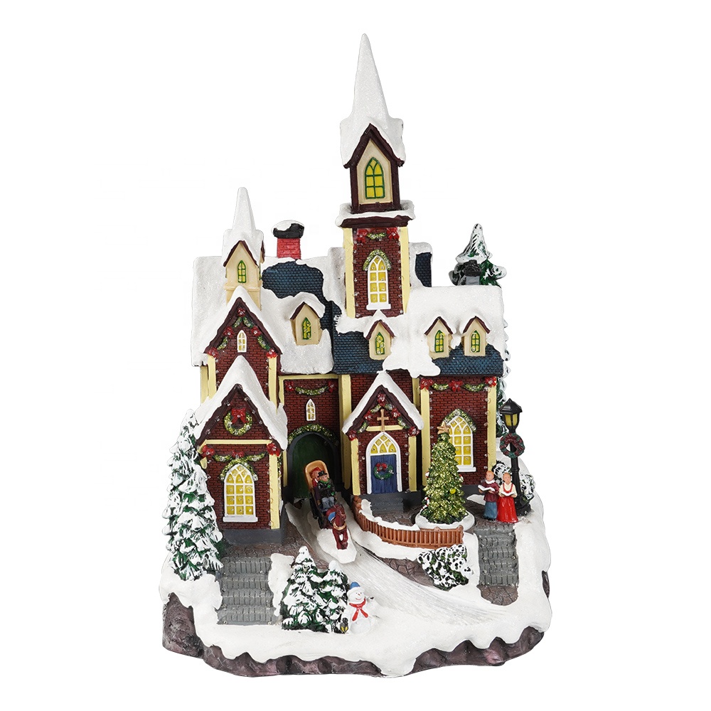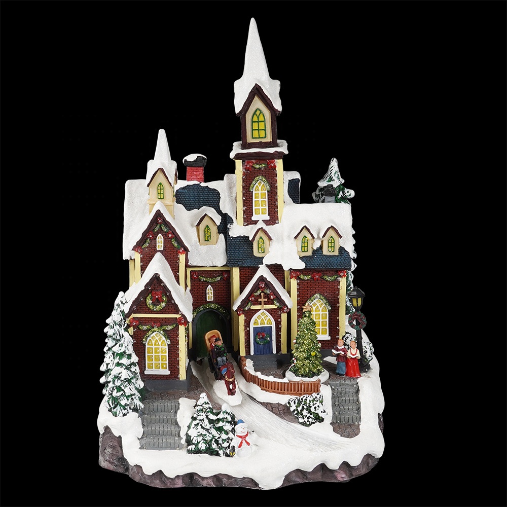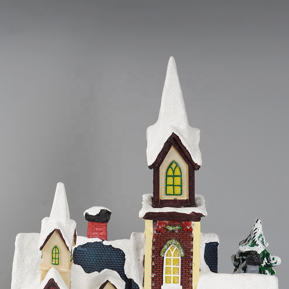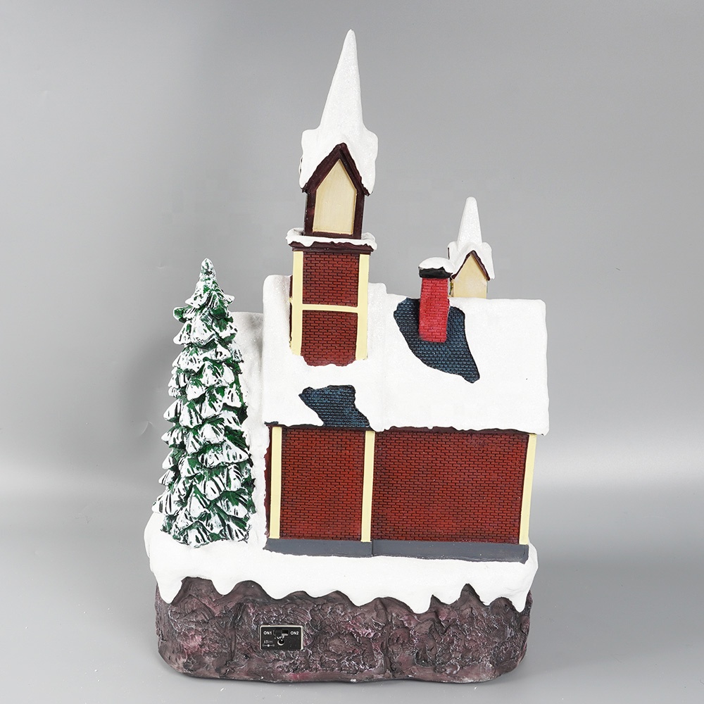Wholesale handmade Xmas scence LED Light up decorative Polyresin Christmas village with rotating Xmas tree