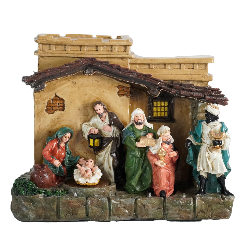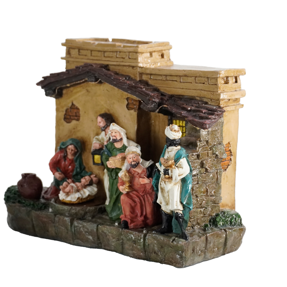 Western Saints Christmas Resin Craft Nativity Religious Music LED Warming Cabin Lights Home Decorations with movement