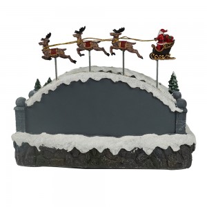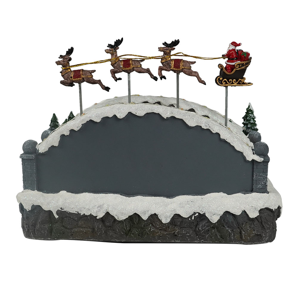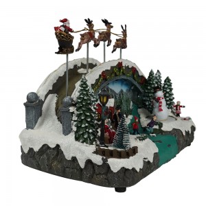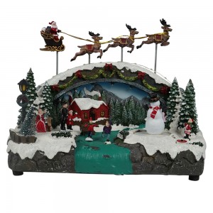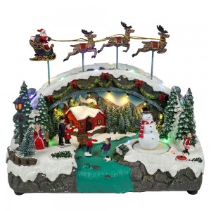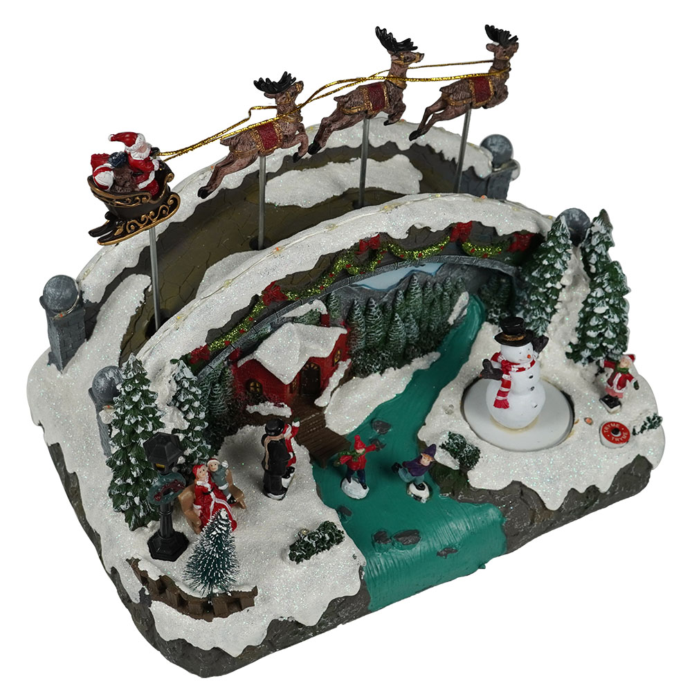 Wholesale led musical Xmas skiing bridge and flying sleigh scene model figurine Christmas decoration with rotating snowman